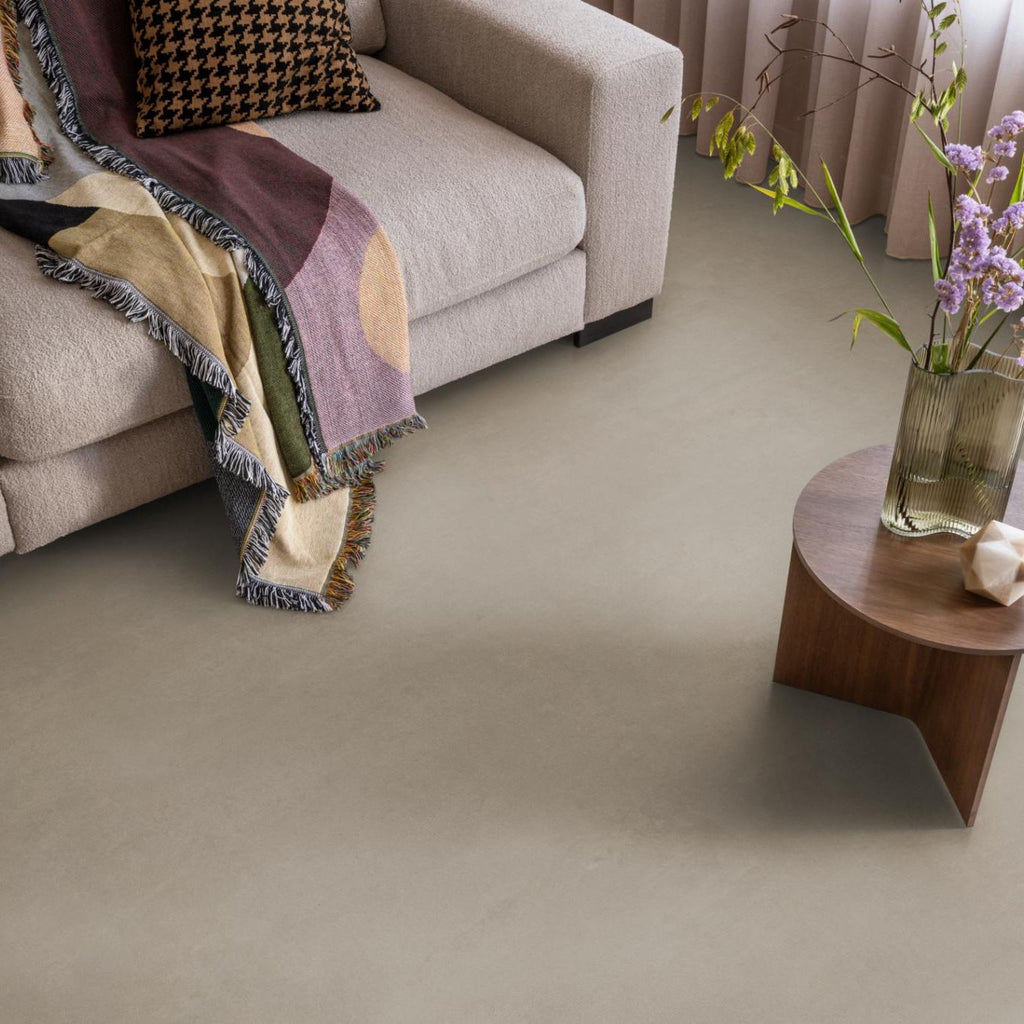 De Ambiant vinyl Sisler heeft een mooie all-over print, waardoor het veel weg heeft van een echte betonlook vloer. De beige en grijze tinten van deze kwaliteiten passen perfect in een trendy industrieel interieur. De vloer is gemakkelijk schoon te maken en is geschikt voor vloerverwarming.