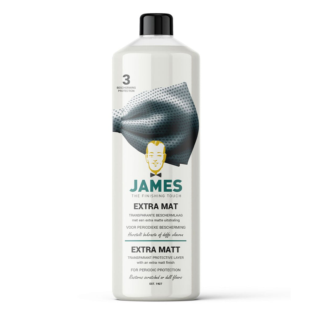 James Extra Mat biedt een extra matte, transparante en antislip beschermlaag voor diverse vloertypes, waaronder vinyl, PVC, linoleum, rubber, natuur- en kunststeen. Deze formule is ideaal voor moderne, ultramatte vloeren of om een bestaande vloer een extra matte uitstraling te geven. Het product beschermt tegen krassen en slijtage, waardoor de vloer langer mooi blijft en eenvoudig te herstellen is bij lichte beschadigingen.